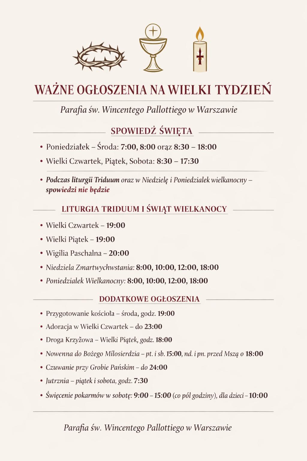 6. Spowiedź święta będzie od poniedziałku do środy: podczas Mszy świętych o godz. 7:00 i 8:00, oraz od 8:30 do 18:00. Ostatnią godzinę, czyli od 17:00 spowiadać będziemy w górnym kościele. W Wielki Czwartek, Piątek i Sobotę, spowiedź od godz. 8:30 do 17:30. Prosimy o odpowiedzialność, by nie odkładać spowiedzi ani na ostatni dzień, ani na ostatnie minuty dyżuru spowiedzi danego dnia. Podczas Liturgii Triduum Paschalnego oraz w święta wielkanocne spowiedzi nie będzie.